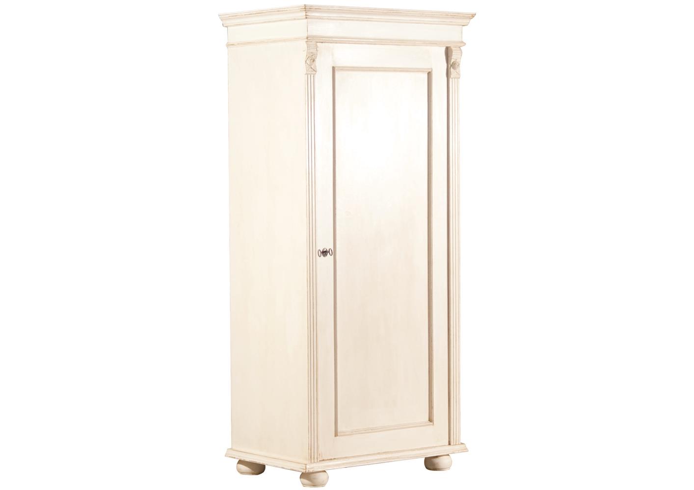 Armoire 1 porte en pin massif blanc antiquaire avec de belles moulures sur les arrêtes. Dans une chambre aux poutres apparentes dans des tons pastels elle donnera de la douceur et du charme. Disponible dans plus de 60 finitions