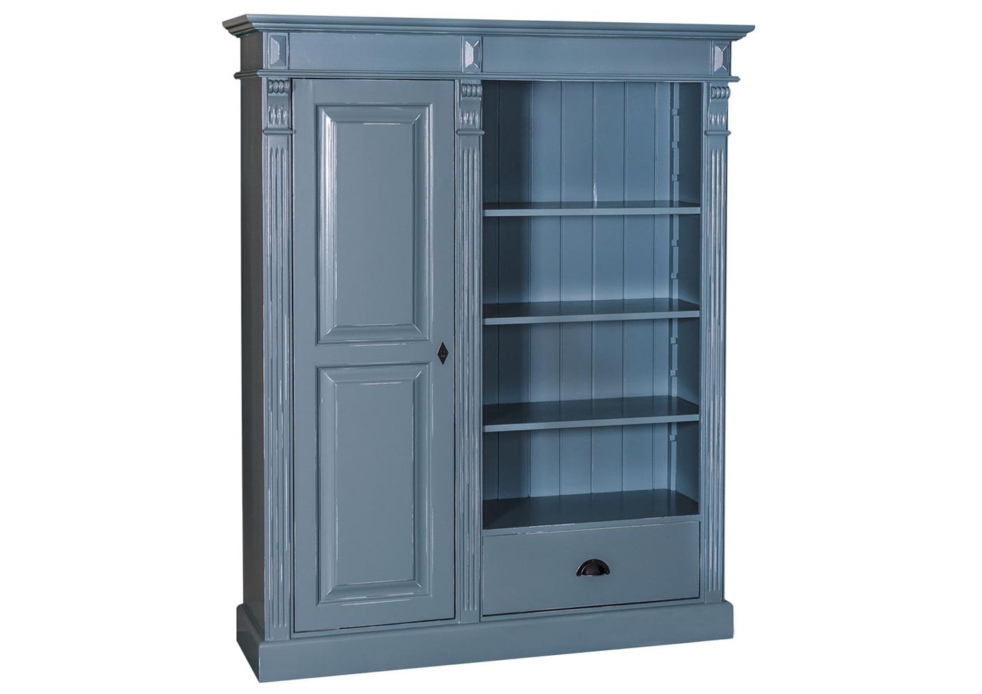 Bibliothèque au style original et atypique en pin massif bleu ciel. Ses étagères ouverte vous permettra de mettre en valeur votre décoration ou vos plus beaux livres. Son côté fermé et son tiroir vous donnera la possibilité de ranger tous vos bouquins.