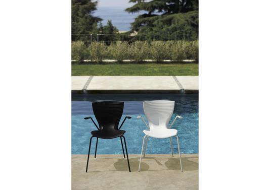 Cette chaise moderne possède une assise et un dossier plein et légèrement striés pour un style plus design. Posés sur une structure en acier se terminant en accoudoirs, cette chaise est légère pour facilité les déplacements.
