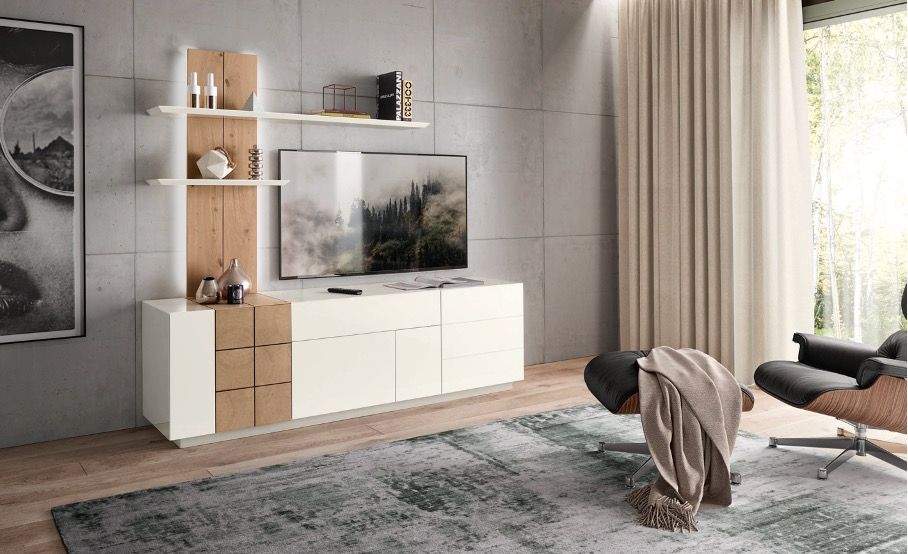Métamorphosez votre salon en un lieu élégant et chaleureux en faisant le choix d’une composition murale design laqué et bois pour habiller le mur de votre pièce. Composée de deux éléments : un meuble TV design et minimaliste de 4 portes et 1 tiroir, avec système "push to open" et un panneau avec 2 étagères en finition chêne avec noeud, cette composition optimise le rangement du salon dans un seul et même meuble. Vos appareils multimédias, vos télécommandes, vos livres et vos objets de décoration : un vase rapporté de Dijon, une bougie d’une boutique de Chalon-sur-Saône... trouveront leur place dans une belle harmonie. Il sera même possible de les mettre en valeur avec l’option éclairage LED pour panneau arrière. Dans le petit salon d’un appartement à Dôle, dans l’immense pièce de vie d’un chalet dans le Jura, dans le séjour contemporain d’une maison à Besançon, comme dans un loft dijonnais à l’esprit indus, ce meuble TV personnalisable dans son coloris à travers le choix de 12 teintes, sa finition, sa forme et sa dimension, s’intègrera partout ! Venez créer votre composition TV murale sur mesure auprès de nos conseillers dans notre magasin de Pierre-de-Bresse ! Profitez-en aussi pour découvrir les autres meubles de la collection.