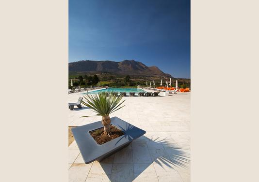 Ce très vaste pot pour grande plante possède une base carrée de taille réduite surmontée d'un très grand plateau carré également et percé dans le même format que la base pour le passage de la terre.