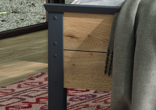Ce lit sur pied apportera une touche industrielle à votre chambre. Il est en mélaminé chêne structuré naturel avec une finition laque métallisée. En option vous pouvez ajouter sur la tête de lit un lot de 2 liseuses à led avec double chargeur USB pour profitez pleinement d'un moment de lecture. Ne faites pas l'impasse sur l'essentiel pour des nuits de rêve, venez prendre les conseils de notre équipe à Pierre de Bresse en sommiers, matelas, couette et oreillers.