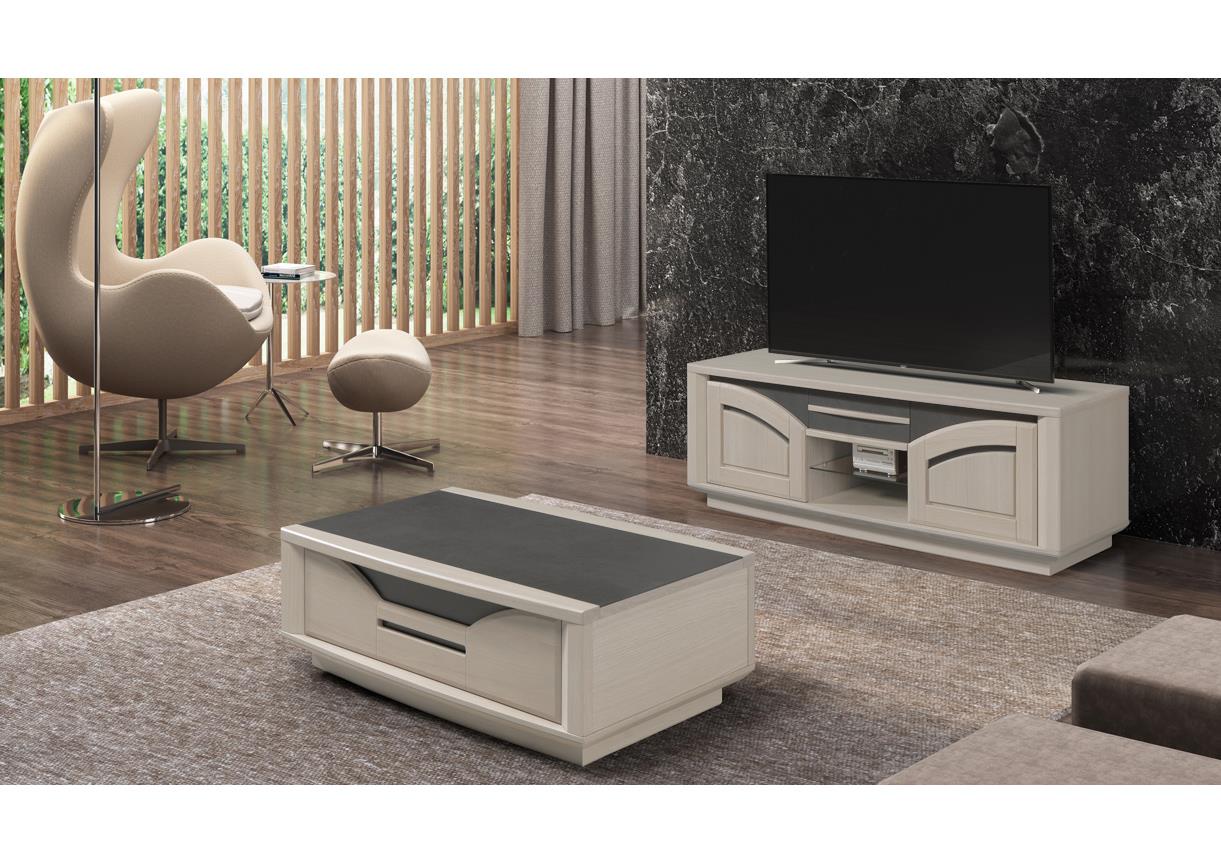 Remise supplémentaire en magasinAvec le séjour, le salon constitue la pièce maîtresse de la maison, l’endroit où l’on se réunit après une journée de travail pour partager un moment convivial, il mérite alors une touche d’originalité dans sa décoration … pourquoi ne pas miser sur un meuble TV contemporain. A la fois élégant et pratique, ce modèle aux lignes classiques associe le chêne massif, disponible en 2 finitions naturel ou naturel blanchi, à la céramique grise, utilisée par incrustation pour arrondir les lignes de la façade. Il dispose d’une grande capacité de rangement avec 2 portes, 1 tiroir et 1 niche centrale divisée en 2 par une tablette en verre, dans laquelle vous pourrez installer votre matériel HIFI et vos décodeurs. Adaptez votre meuble TV à la dimension de votre pièce en choisissant soit ce modèle en 155cm ou une dimension plus petite de 115cm sous la forme avec 1 tiroir et 1 niche. Mettez le cap sur SIMEUBLE à Pierre-de-Bresse pour venir découvrir un magasin de mobilier atypique à seulement 40min de route de Lons-le-Saunier.