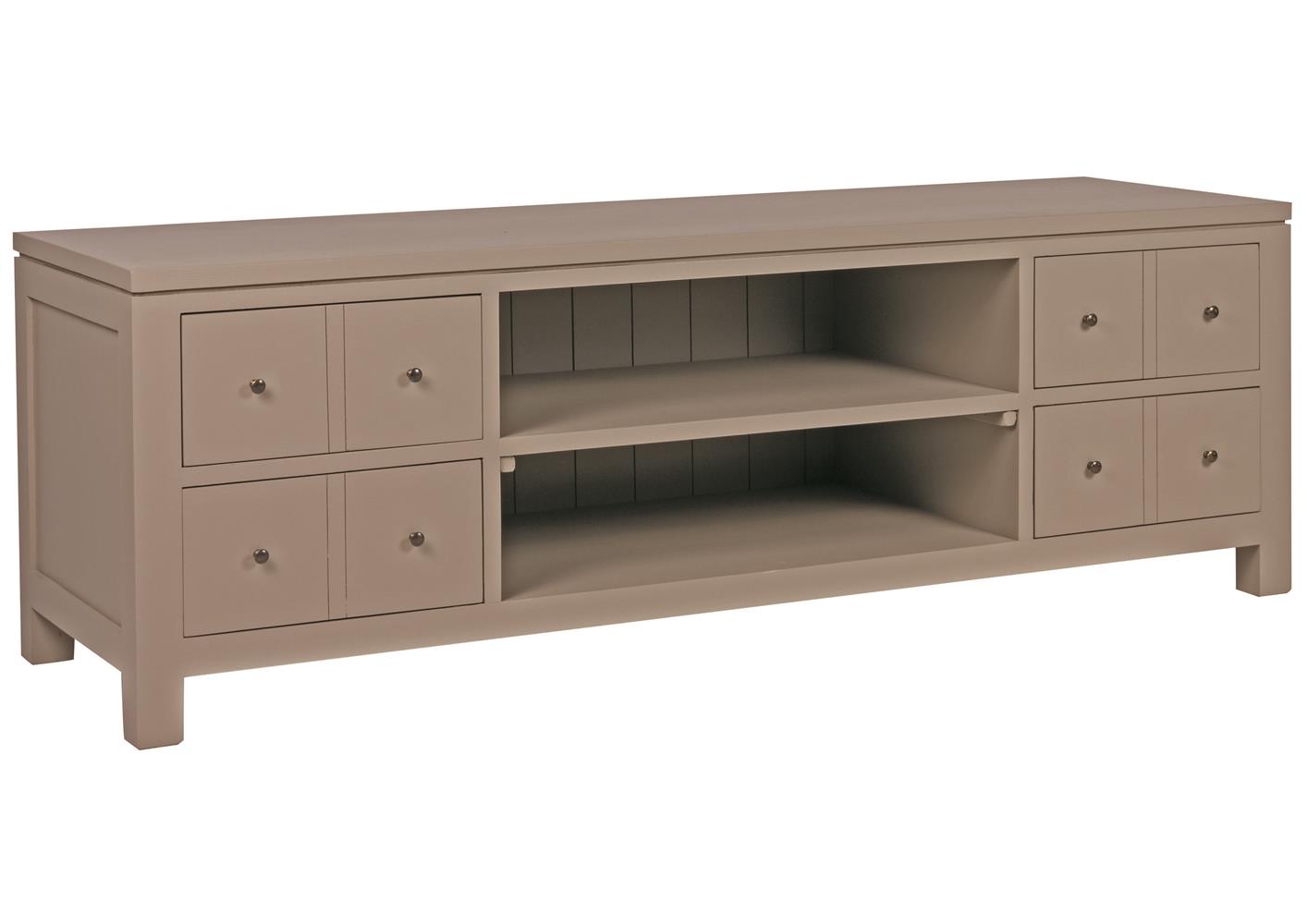 Meuble télé atypique en pin massif 4 tiroirs et 2 niches. Donnez une ambiance cosy dans votre salon en choisissant des tons taupe, gris, beige? Associé à un joli tapis vous créerez un espace chaleureux et convivial idéale pour les longues soirées d'hiver. Disponible dans plus de 60 finitions.