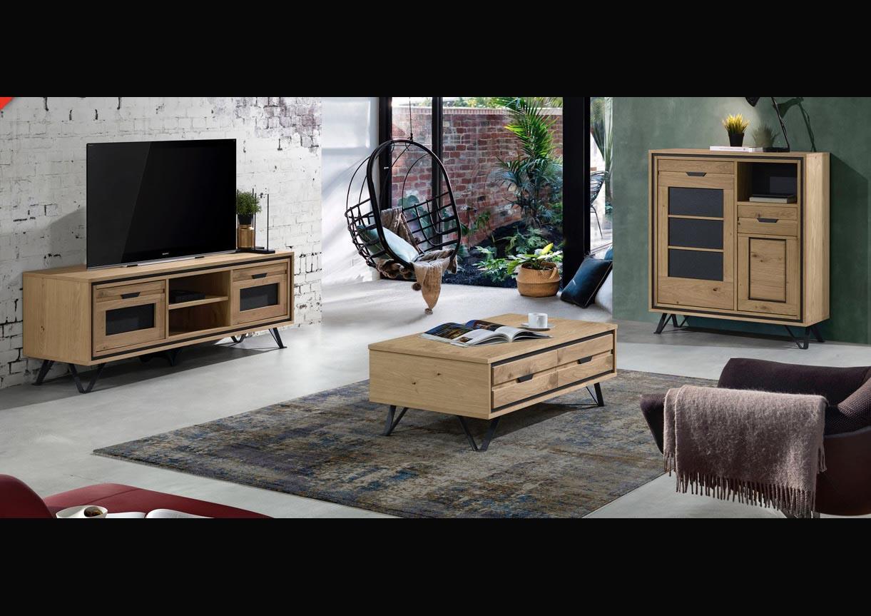 Remise supplémentaire en magasinLe meuble TV n’est pas seulement un support pour le téléviseur, son design participe à l’ambiance que vous souhaitez donner à votre salon. Ce modèle en associant un matériau noble et naturel comme le bois en finition brossé et le métal, s’intégrera facilement dans votre décoration intérieure que vous souhaitiez un esprit loft industriel, ou une ambiance chaleureuse et moderne. Ses lignes restent épurées, finalement, l’originalité rappelant le style indus se trouve davantage dans son piètement épingle en métal et le décor « métal ajouré » des 2 portes. Côté rangement, vous allez être servi grâce à ses 2 portes et sa niche centrale divisée en deux par une tablette réglable et bénéficiant d’un passage de fils pour recevoir votre matériel HIFI. Complétez ce meuble avec la table de salon plateau relevable de la même collection, et le tour est joué pour vous créer des souvenirs mémorables dans une pièce chaleureuse et bien rangée ! Pour vous permettre de vous projetez, venez découvrir le modèle 1 porte 118 cm dans notre magasin de Pierre-de-Bresse, en plein cœur de la Bresse et à seulement 45 min de Beaune.