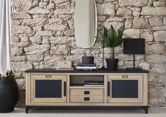 Meuble TV industriel avec portes et niches en teck