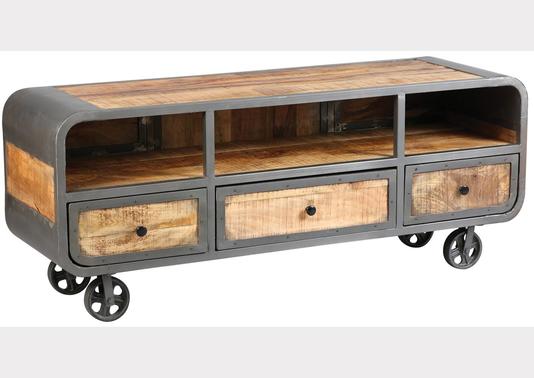Après une promenade aux cascades du Hérisson, profitez d'un bon film confortablement installé devant votre meuble TV au style indus. Pour les objets dont vous aurez besoin au quotidien, il dispose d'un grand espace de rangement ouvert, pour le reste de vos bibelots vous pourrez utiliser ses 3 tiroirs. Déplacez-le aisement dans votre salon grâce à ses roulettes en métal. Sa conception en acier et palissandre massif apportera du charme à votre intérieur et s'intégrera parfaitement à la décoration de votre chalet jurassien, de votre appartement à Dôle, ou de votre maison près de Poligny.