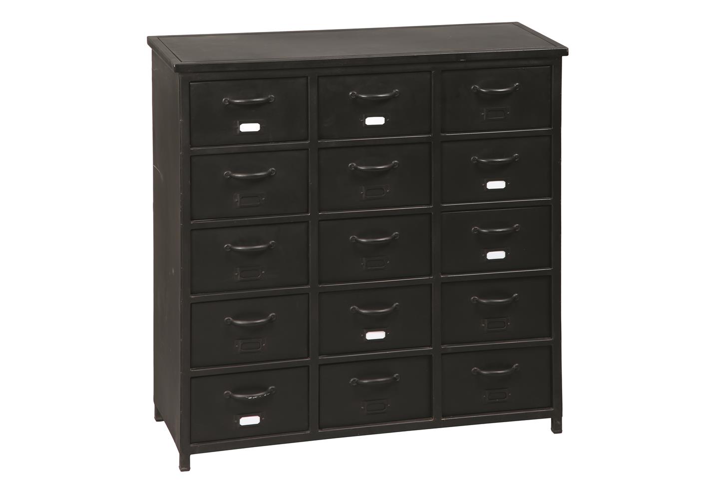 Meuble de rangement en métal noir offrant 15 tiroirs. Cet article est en cours de suppression chez le fournisseur, nous consulter pour les stocks et disponibilités.