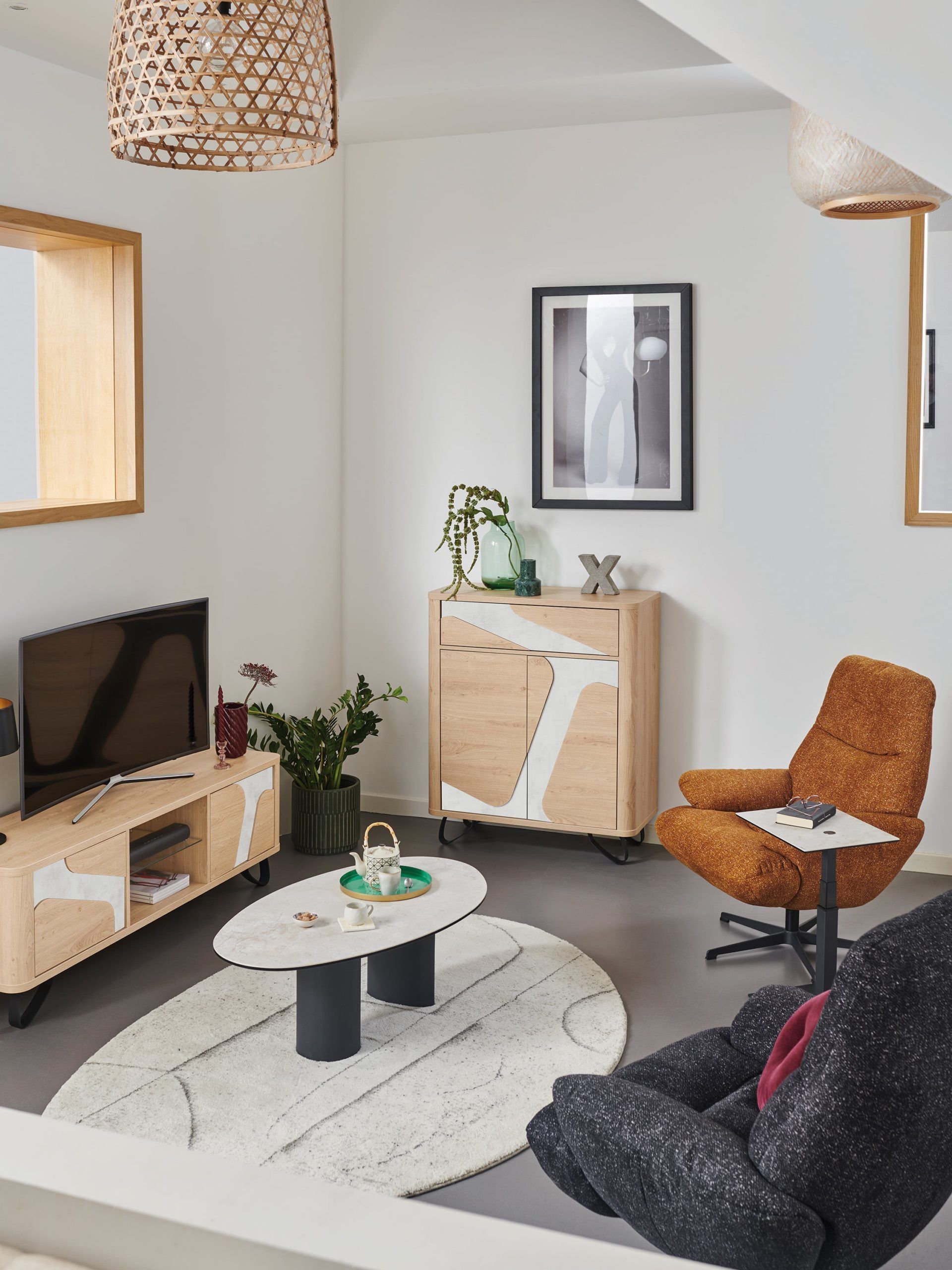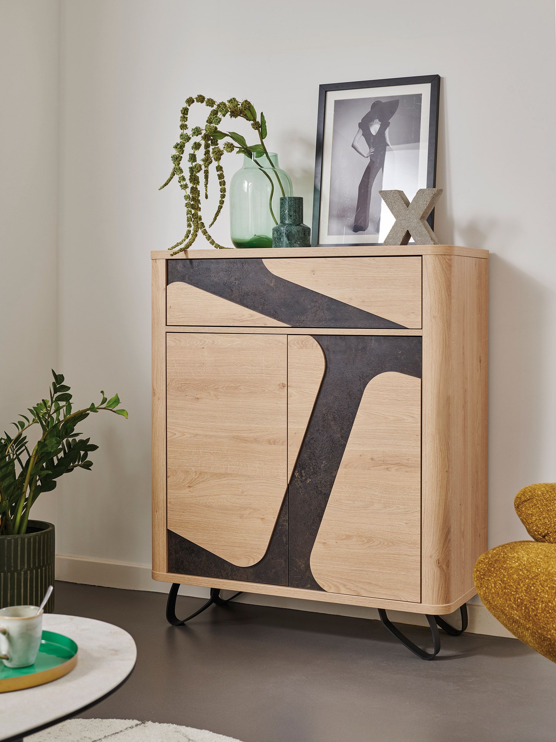 Apportez une touche déco tout en profitant d’un espace de rangement pratique avec ce petit meuble design. Doté d’un tiroir, idéal pour ranger de petits objets ou pour servir de vide-poche et de deux portes qui dissimulent une étagère, il pourra facilement être installé dans une entrée, un salon ou une salle à manger comme meuble d’appoint. Son look épuré avec sa jolie teinte chêne naturelle lui permettra de s’intégrer dans un univers contemporain en choisissant les détails en façade en finition gris anthracite ; ou dans une atmosphère cocooning et chaleureuse avec les détails en finition travertin. Venez découvrir un grand choix de meubles à la fonction polyvalente en magasin à Pierre-de-Bresse entre Chalon, Dôle, Besançon et Lyon.