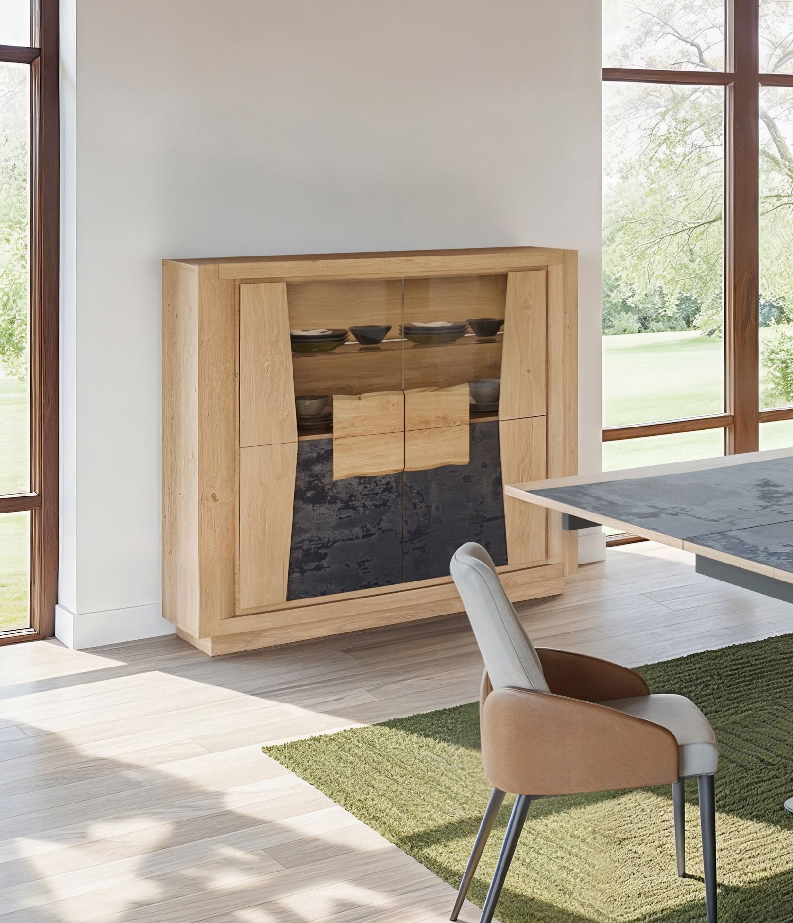 Chêne massif et placage, Verre, Céramique