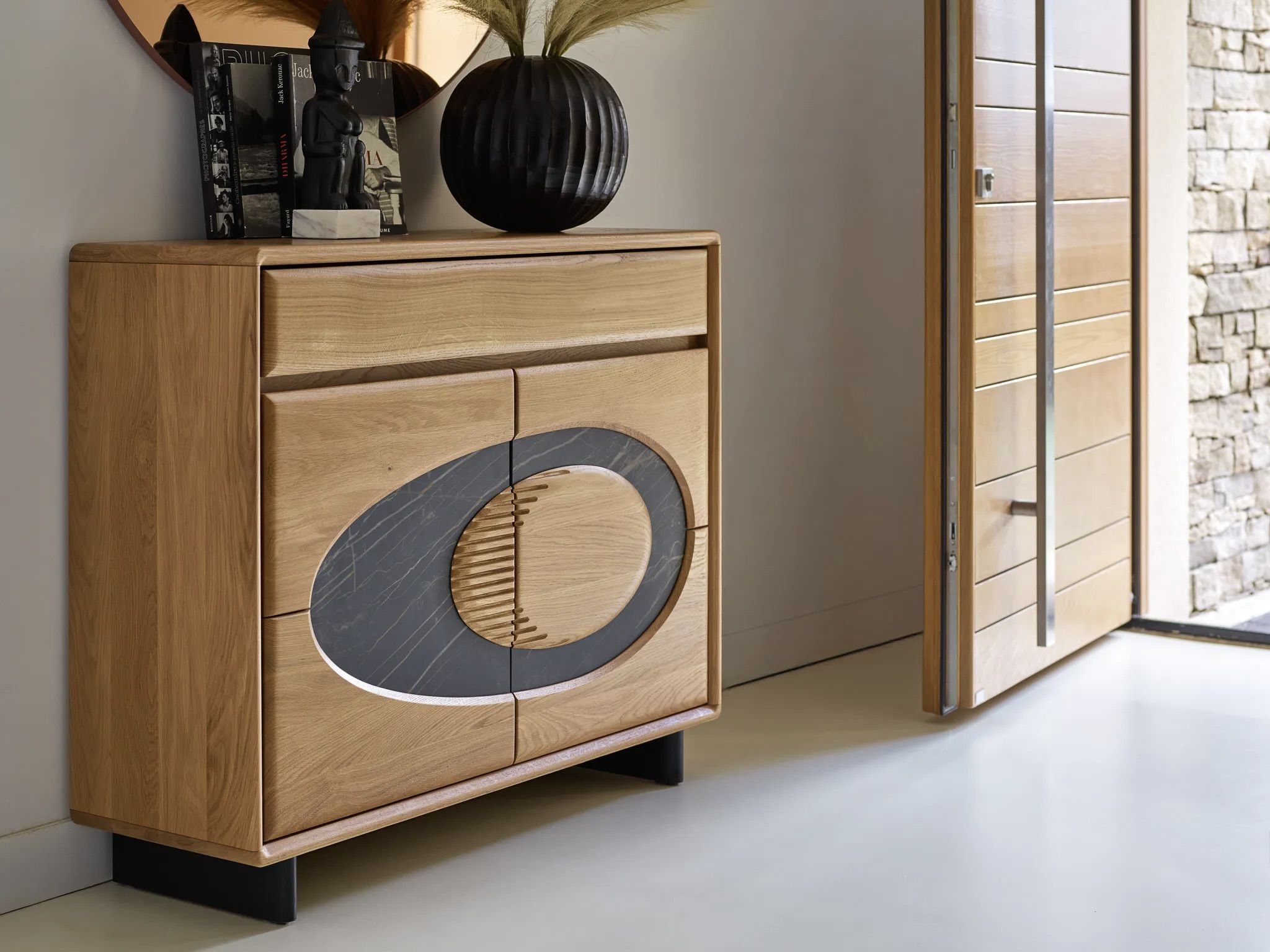 Meuble d'entrée en chêne avec détail en céramique