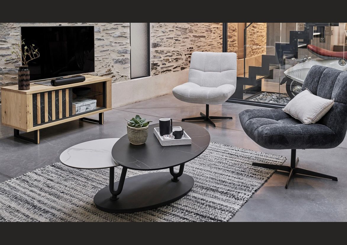 Remise supplémentaire en magasinCréez une atmosphère chaleureuse et réconfortante pour regarder la télévision après une journée shopping à Dijon en installant, dans votre salon, ce très beau meuble TV. Pour provoquer chez vous un véritable coup de coeur, ce meuble HIFI mise sur l'association de 3 matières : le bois, le métal et la céramique, ainsi que sur le travail en relief de la façade grâce à une alternance de baguette en bois et de céramique marbrée pour un rendu mouluré du plus bel effet. Les pieds métal avec incrustation bois apportent de la légèreté à l'ensemble du meuble. En plus de correspondre parfaitement à vos attentes de style en s'harmonisant facilement avec votre canapé en tissu et votre table basse en métal, ce meuble TV se révèle fonctionnel. Il dispose d'une porte pleine pour dissimuler vos affaires, et d'une niche avec tablette en verre et passage de câbles pour vos décodeurs et votre box internet.