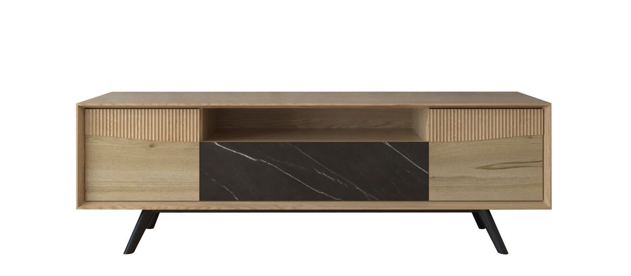Succombez au style tendance de ce superbe meuble TV pour aménager le salon chaleureux de votre appartement dans le Jura ou le grand espace séjour de votre loft industriel à Mâcon. Il vous servira de meuble de rangement avec un espace organisé en 4 grands compartiments 1 niche pour le matériel HIFI, 1 tiroir pour les télécommandes, les câbles ... et 2 portes latérales pour les DVD, les CD et les livres par exemple. Grâce à l’esthétique tendance de sa façade qui mélange le bois rainuré, le bois lisse et la céramique ce meuble TV deviendra aussi une pièce déco que vous pourrez personnaliser à votre image. En effet, pour l’harmoniser avec votre canapé et votre table basse vous aurez le choix entre 2 finitions : chêne et noyer, et différentes céramiques. Il sera aussi possible de réaliser ce meuble TV entièrement en bois. En + de la télévision, ajoutez sur son grand plateau disponible en 2 dimensions L180 ou L200 cm, un joli luminaire et des petits objets de décorations rapporté de Beaune, Autun, et Besançon pour parfaire l’ambiance de votre pièce !
