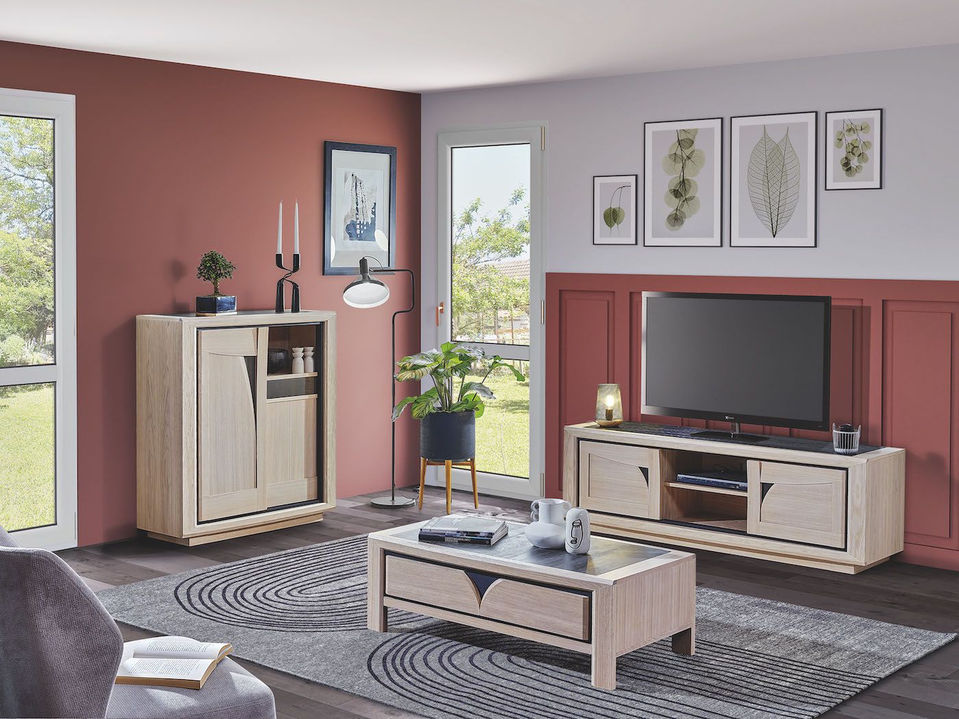 Remise supplémentaire en magasinC'est le meuble indispensable du salon, le meuble TV, celui qui vous permettra de profiter d'un agréable moment devant un film après une journée shopping à la toison d'or. Votre téléviseur sera mis en valeur sur son plateau et vous profiterez de différents rangements : d'une niche avec passage de câble très pratique pour installer pour votre décodeur et votre matériel audio, et d'un espace de rangement derrière 2 portes coulissantes pour ranger les câbles, les télécommandes, et les magazines. Son esthétique agréable et contemporaine avec une façade en courbe et des incrustations de céramique grise peut correspondre à différents style. Pour une décoration contemporaine la couleur teinte chêne naturel sera parfaite, la teinte ton brut apportera une touche chaleureuse dans votre intérieur. Associez-le à une table basse en céramique et métal, ainsi qu'un agréable canapé d'angle en tissu, choisissez une décoration à votre goût, et métamorphosez votre salon en un véritable espace de détente et de convivialité.
