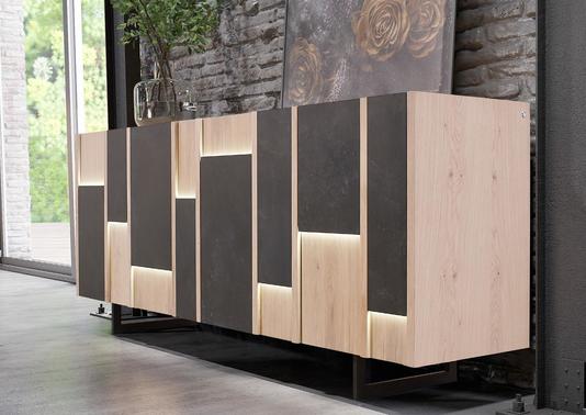 Avec sa façade en bois et inserts céramique, cette enfilade fera sensation auprès de vos convives dans votre salon ou salle à manger. Votre vaisselle trouvera naturellement sa place sur les étagères présentes derrière ses quatre portes. Son tiroir intérieur avec aménagement facilitera le rangement de vos couverts. Le plus, son interrupteur tactile avec variateur d’intensité éclairera la façade pour faire de votre bahut la pièce forte de votre décoration. Cette enfilade existe aussi en version avec façade tout bois. Venez découvrir cette collection en magasin et demander conseil à notre équipe.