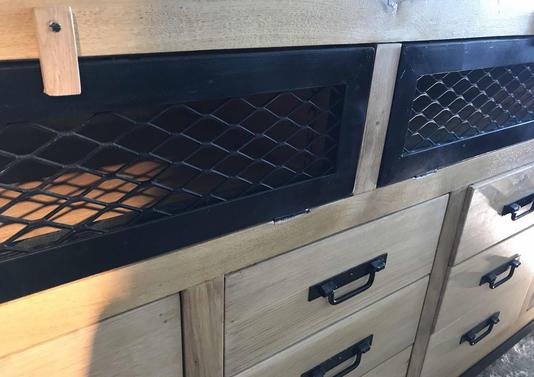 Cette belle enfilade style atelier en chêne massif et fer a été réalisée par un artisan en Saône-et-Loire. Elle est composée de 2 portes et de 6 tiroirs. Son encadrement est en fer. Fait sur-mesure, nous pouvons créer le meuble que vous souhaitez selon vos propres envies !