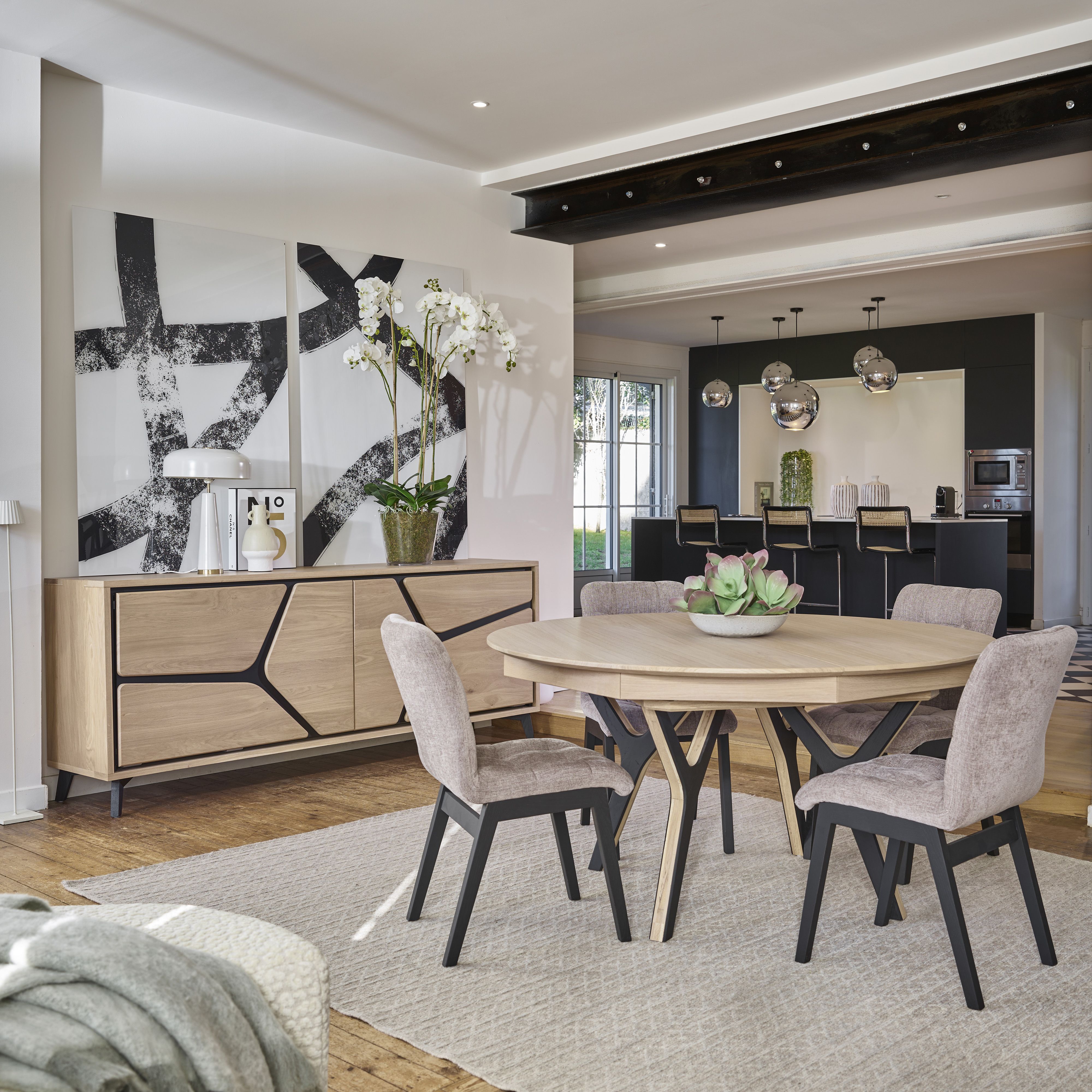 Remise supplémentaire en magasinVous êtes conquit par l’idée de meubler votre salle à manger avec une enfilade ? Laissez-vous séduire par ce modèle moderne et authentique en chêne massif, au piètement simple et la façade joliement décorée de formes organiques sublimées par une finition noire. Vous serez surpris par son grand espace de rangement ! Ce dernier est caché derrière 2 portes coplanaires qui s’ouvrent en se glissant l’une devant l’autre, un vrai atout surtout si vous disposez d’un espace réduit entre votre meuble et votre table de séjour. Ce bahut dispose aussi d’options agréables. Vous aurez la possibilité d’ajouter un éclairage intérieur LEDS à l’ouverture des portes, dans ce cas les tablettes bois sont remplacées par des tablettes design en verre grisé prêtes à reçevoir votre vaisselle. Ce meuble de rangement va acceuillir votre vaisselle de tous les jours ? Vous serez ravi de pouvoir ajouter un tiroir suspendu sous plateau côté gauche pour vos couverts.