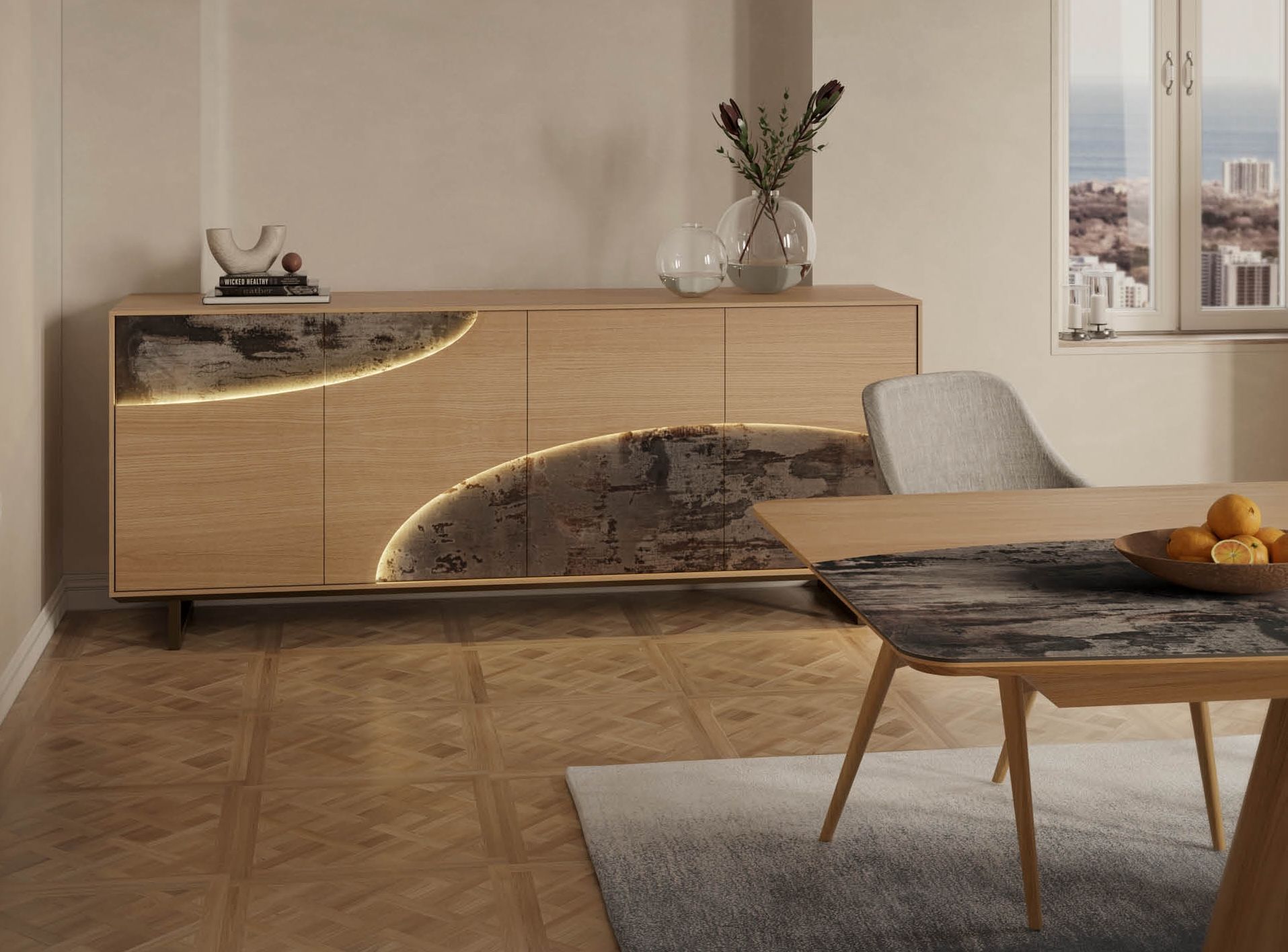 Vous êtes à la recherche d’un meuble de rangement qui soit à la fois esthétique et pratique, cette enfilade en chêne 4 portes devrait vous plaire. Elle se distingue par une façade jolie décorée avec des motifs courbés dont vous choisirez la finition céramique (2 coloris) ou bois massif (2 coloris) et des pieds métal qui apportent de la légèreté. L’ensemble est souligné par un éclairage LED. Dans une salle à manger moderne accompagnée d’une table en céramique et de chaises design moelleuses, dans un séjour conviviale et chaleureux avec une grande table en bois et des fauteuils velours colorés, ou bien dans une cuisine ouverte ce buffet apportera une touche élégante et un espace de rangement généreux. Vous pourrez ranger votre vaisselle, verrerie et linge de table dans les 4 grands compartiments avec étagères; et profiter du plateau pour décorer votre pièce. Cet enfilade existe aussi avec 2 portes coplanair, et en + grande dimension : L220 cm.