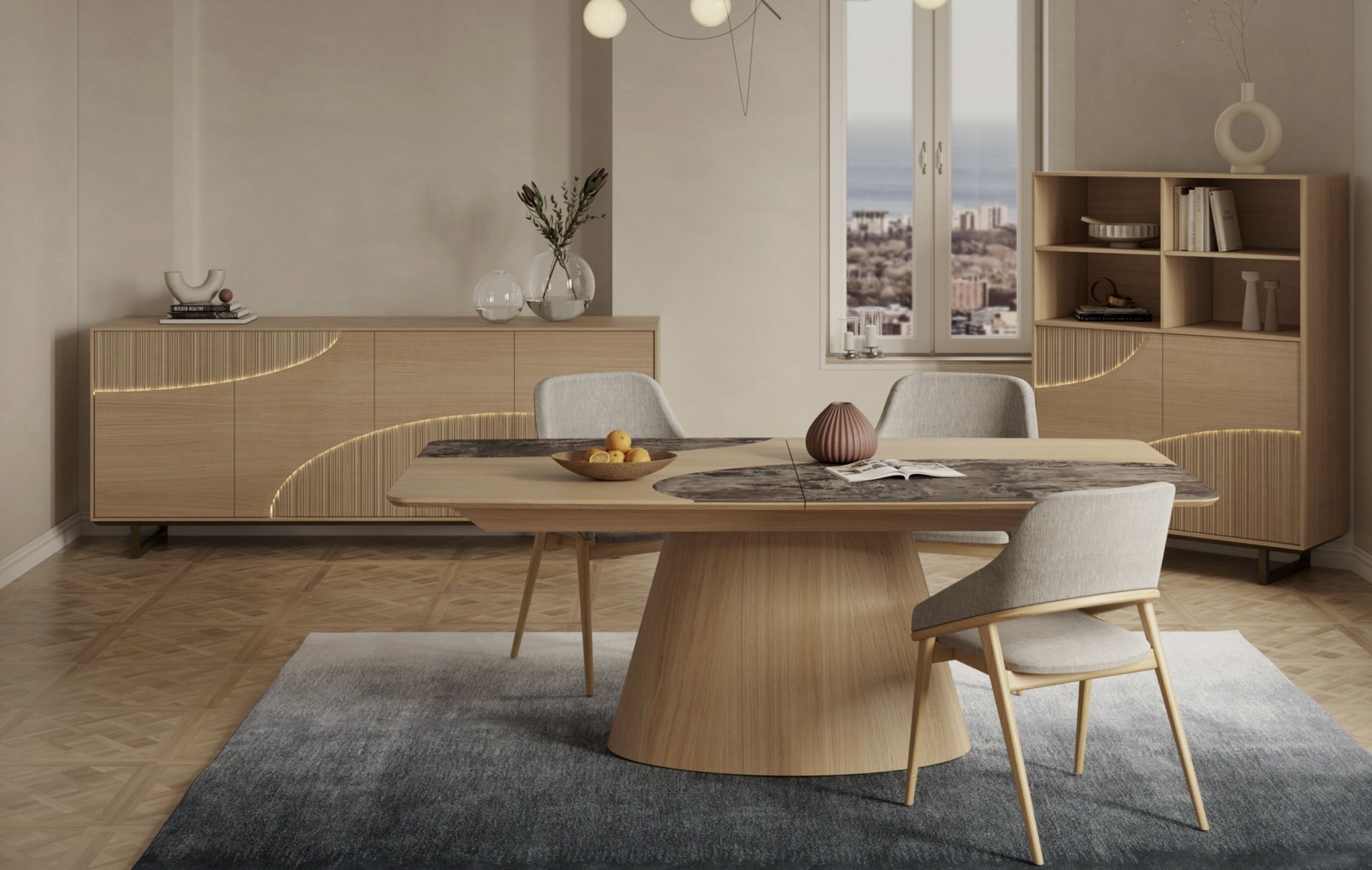 Chêne massif et placage, métal, Céramique