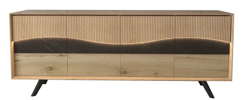 Cette enfilade 4 portes se distingue par sa façade contemporaine qui mélange l'authenticité du bois apposé en rainures et la modernité de la céramique et des pieds laqués. Elle propose 2 finitions de bois : chêne ou noyer et un très beau choix de céramique et de couleurs de pieds pour s’harmoniser à la décoration intérieur de votre pièce et correspondre à votre goût. Mettez en valeur, la nouvelle pièce déco de votre salon en ajoutant l’option éclairage LED dans les portes et en agrémentant le plateau bois ou céramique de vos + beaux objets. En plus de son visuel unique et tendance, ce buffet propose une capacité de rangement très pratique avec 2 grandes étagères amovibles pour accueillir de la vaisselle et du linge de maison. Ce meuble de rangement est placé dans votre séjour aux côtés de votre table de repas ? Vous apprécierez d’ajouter en option un tiroir intérieur avec range couverts pour garder à porter de main la vaisselle du quotidien. Ce buffet est aussi disponible dans une + grande dimension L230.