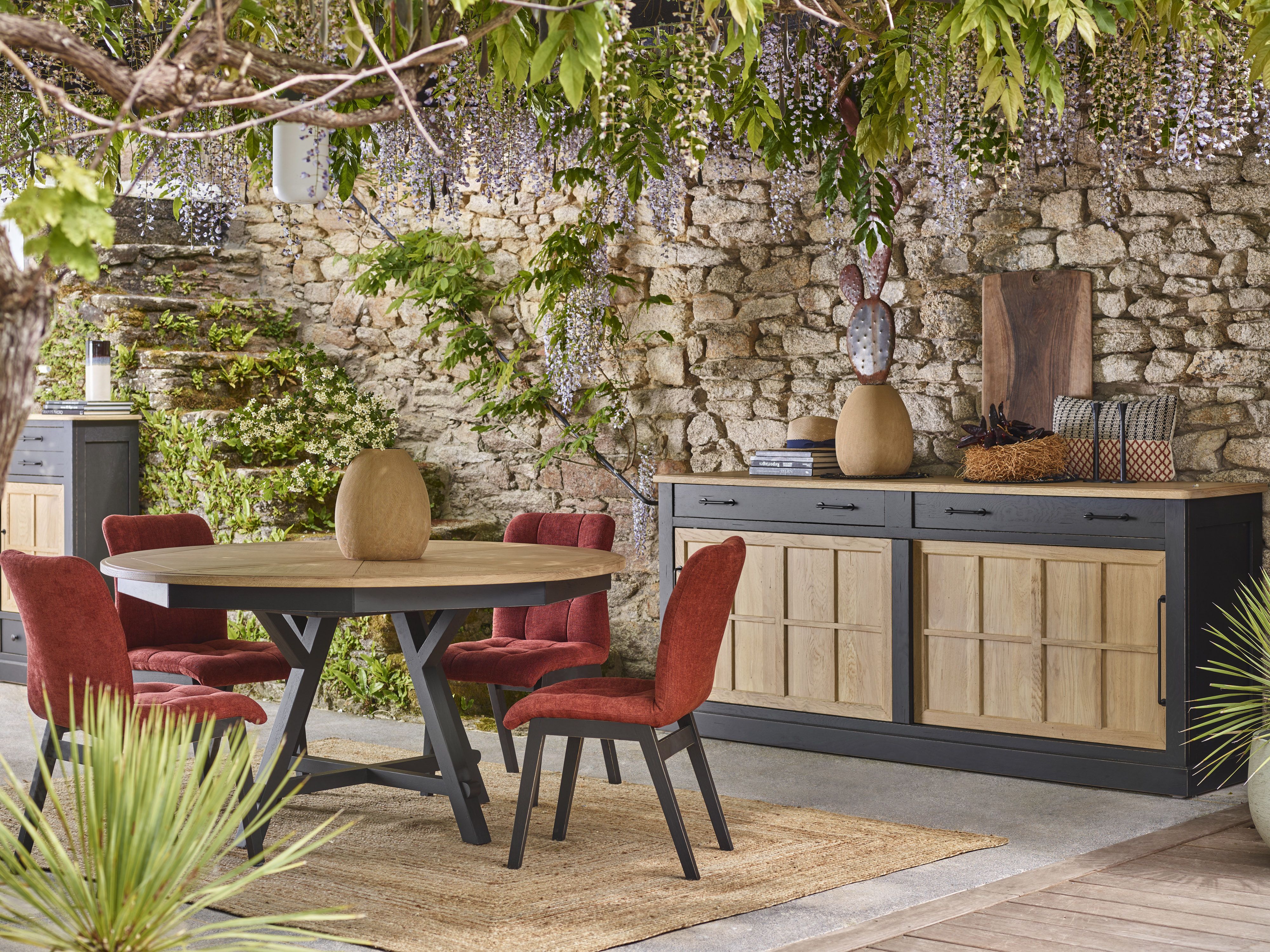 Remise supplémentaire en magasinÉchappez-vous de l’agitation de la vie Dijonnaise sans quitter votre salle à manger avec ce bahut d’inspiration campagne chic qui vous rappellera vos week-end en Bresse bourguignonne … Le mélange du chêne naturel et de la finition noir mat, les détails sur les portes, et les poignées en métal donnent vie à un meuble authentique et moderne ! Pour une atmosphère encore plus chaleureuse choisissez ce modèle en finition lin. Avec ses 2 portes coulissantes et ses 2 tiroirs cette enfilade vous offre un espace de rangement important et optimal qui facilitera votre quotidien ! Installée dans un séjour de caractère avec poutres apparentes ou mur en pierre, elle vous permettra d’organiser les plats, les assiettes, les verres et les couverts que vous utilisez lorsque vos amis viennent partager un verre de vin du Jura et un bon repas. Dans une véranda à la décoration résolument contemporaine avec une touche industrielle ce meuble apportera chaleur et convivialité, ainsi qu’un espace de rangement pour le linge de maison, les livres ou d’autres bibelots. Entouré d’un confortable fauteuil en tissu et d’un tapis décoratif, il créera l’endroit parfait dédié au calme et à la détente ! Venez découvrir cette collection made in France, ses différentes finitions et dimensions possibles en magasin à Pierre-de-Bresse.