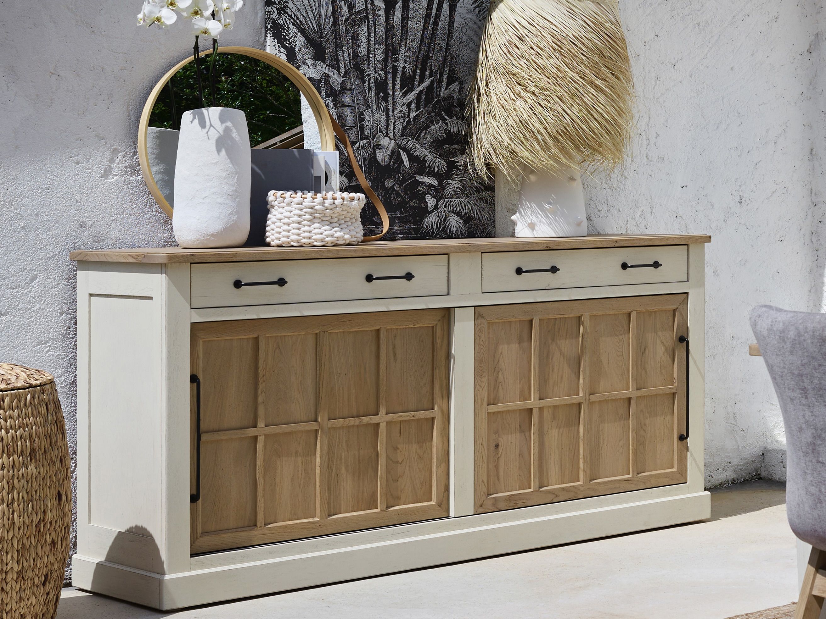 Remise supplémentaire en magasinFaites entrer l’ambiance chaleureuse des vacances en bord de mer dans votre intérieur en craquant pour cet élégant bahut de fabrication française, conçu en chêne massif ! Vous apprécierez les touches de bois naturels des portes et du plateau qui viennent contraster avec la finition lin du reste de la structure pour donner au meuble un caractère authentique. Les poignées fines en métal apportent une note plus contemporaine! Pour un style plus moderne, voir industriel choisissez ce meuble en finition noir mat et chêne naturel. Fonctionnel, cette enfilade vous offre un grand espace de rangement. Faites coulisser les 2 belles portes détaillées pour pouvoir ranger convenablement vos plats en porcelaine sur une étagère, puis ouvrez les 2 tiroirs pour ranger des couverts ou du linge de maison. Profitez-en pour décorer le dessus du plateau avec de beaux objets et une lampe découverts chez Simeuble, avant de penser à associer ce buffet avec une table rustique dans les mêmes tons et des chaises aux couleurs claires pour rendre votre pièce de vie encore plus conviviale ! Au retour d’une journée de travail passée à sillonner la route entre Dôle et Lons-le-Saunier, vous apprécierez de vivre un vrai moment d’évasion pendant vos repas confortablement installé autour de votre table de salle à manger. Venez découvrir notre magasin en plein coeur de la Bresse bourguignonne à Pierre-de-Bresse !