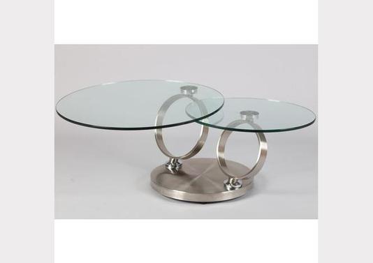 - Table basse ronde en verre avec double plateau pivotant et pied original en acier brossé