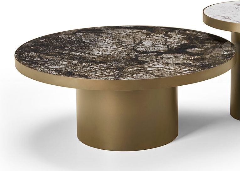 Que diriez-vous de réunir autour de cette élégante table basse ronde votre famille et vos amis pour un apéritif aux saveurs bourguignonnes ? Sa forme conviviale et son généreux diamètre de 88 cm en font la table parfaite pour recevoir ! Pratique, elle apportera aussi une touche déco dans votre salon. Son plateau en céramique marbré campé sur un pied cylindrique en métal couleur bronze se plaira particulièrement dans un univers moderne ou industriel aux côtés d’un meuble TV en métal et d’autres meuble de séjour design. Cette collection vous plait vous pouvez aussi craquer sur le guéridon, pour une table d’appoint à côté du canapé.