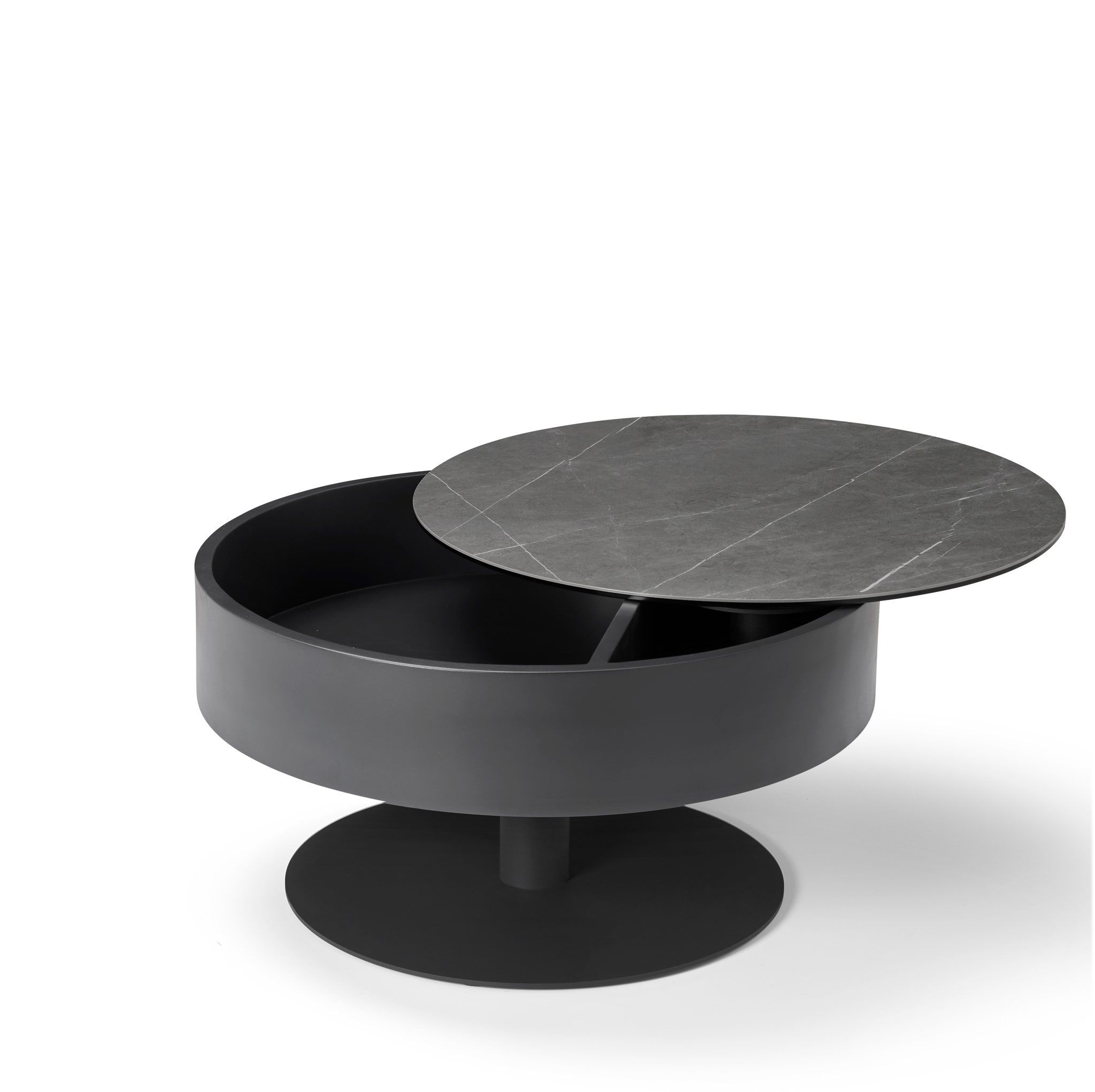 Table basse ronde plateau céramique avec rangement astucieux