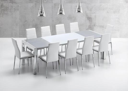 Cette table possède deux pieds en inox qui forment un pont. Visibles sur le plateau de la table, ils s'accordent parfaitement avec les matières du plateau en finition bois, métal, verre ou encore céramique. Très moderne, cette table peut s'allonger grâce à une allonge de 60 cm ou 2 allonges de 45 cm.
