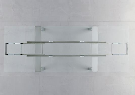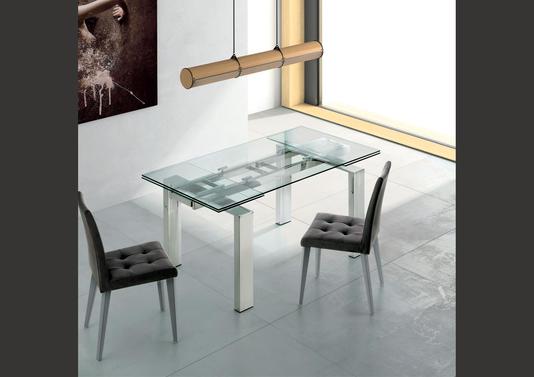 Cette table moderne possède un plateau en verre transparent pour encore plus de cachet. Ses pieds en pont sont en inox. Avec ou sans allonge, cette table est adaptée à vos gouts, vos envies, et vos besoins.