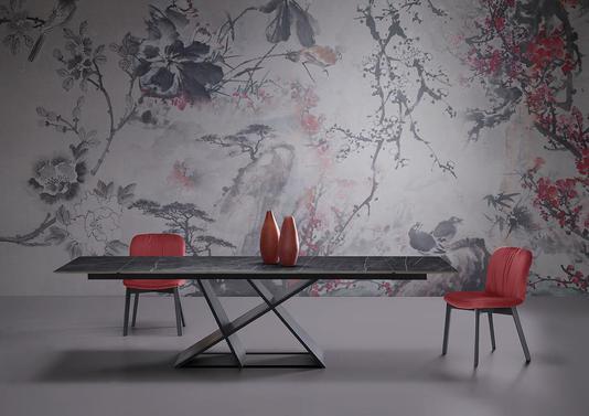 Cette grande table très large peut encore s'allonger en un geste pour le plaisir de vos convives. Originale grâce à ses pieds géométriques, elle se compose d'un plateau en bois qui repose sur ces pieds centraux.