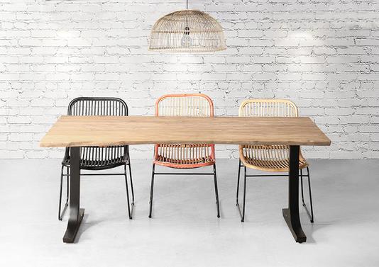 Très belle table industriel avec un pied en acier gris foncé et un plateau en teck recyclé naturel ou noir. Sa finition irrégulière en forme de vague lui donne un aspect brut qui vous plaira assurément.