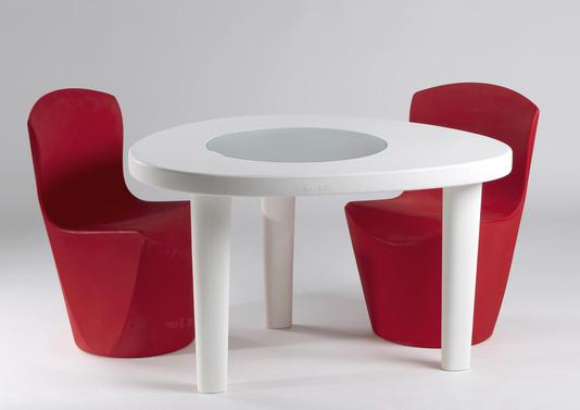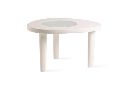 Cette table ovale possède trois pieds cylindriques surmontés d'un plateau avec un rond de verre opaque. Originale, cette table se glissera facilement dans les petits espaces.