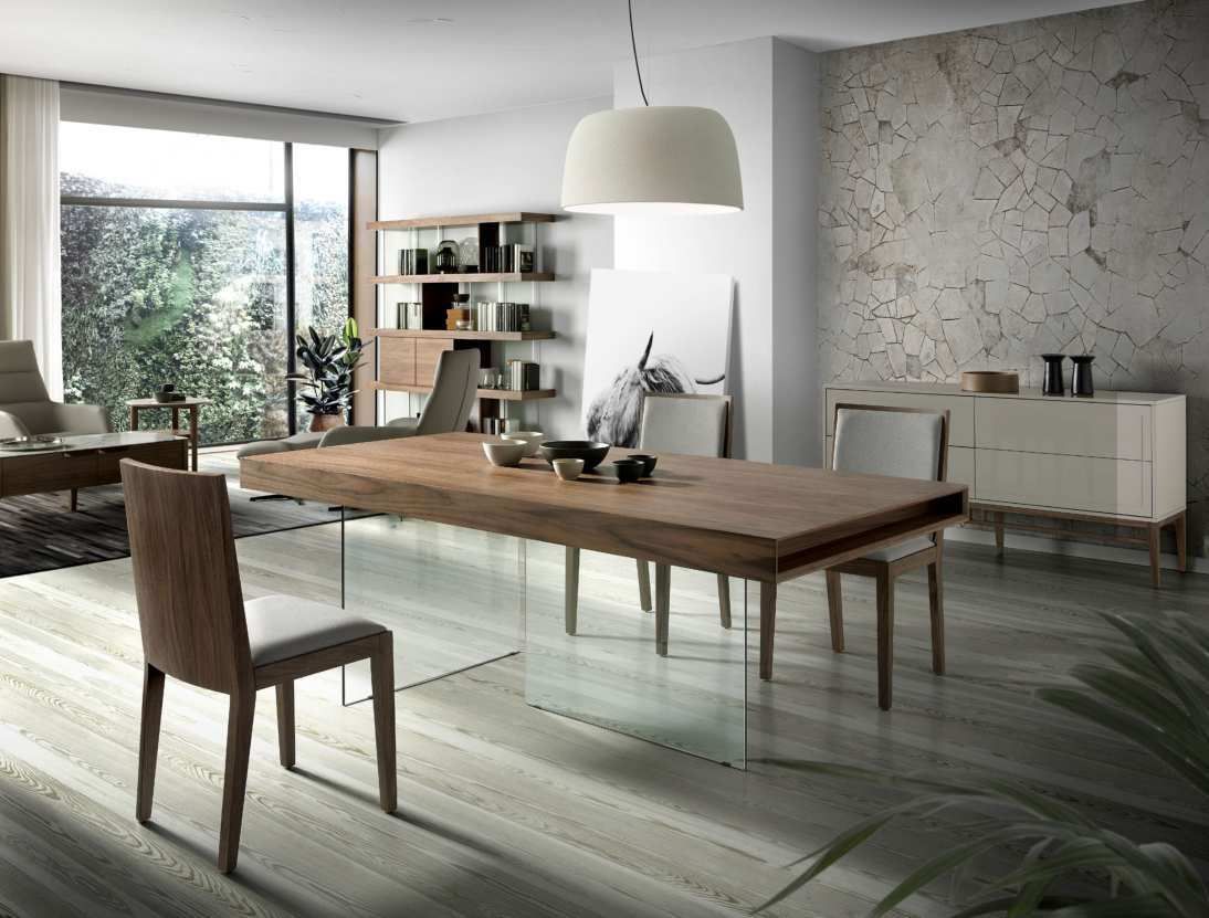 Table de repas en noyer avec pied design en verre