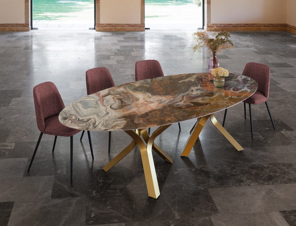 Cette magnifique table ovale vous promet d’être fonctionnelle et accueillante tout en s’intégrant parfaitement dans votre décoration intérieure. Son élégant plateau en céramique, réalisable aussi en dekton (option) repose sur 1 ou 2 pieds design torsadés en métal. L’ensemble est personnalisable et disponible dans différentes finitions et coloris. Cette table de repas sera donc du + bel effet dans un séjour contemporain ou industriel comme dans une salle à manger cosy. Accompagnée de confortables fauteuils en velours, elle accueille jusqu’à 4 personnes pour la dimension 160 cm ; 6 personnes pour la table en 180 et 8 personnes pour un plateau de 200cm. Votre salle à manger est le lieu où toute votre famille aime se réunir, cette table conviviale existe aussi en + grande dimension jusqu’à 350 cm, venez prendre conseil auprès de notre équipe à Pierre de Bresse. Notre magasin de mobilier se trouve à 1h de Dijon, 1h20 de Mâcon et 45min de Chalon-sur-Saône, vous découvrirez un grand choix de meubles pour votre salle à manger : enfilade, buffet, vitrine, table, et chaises..