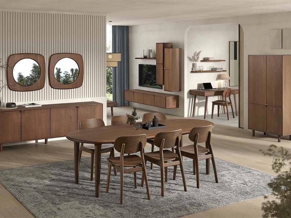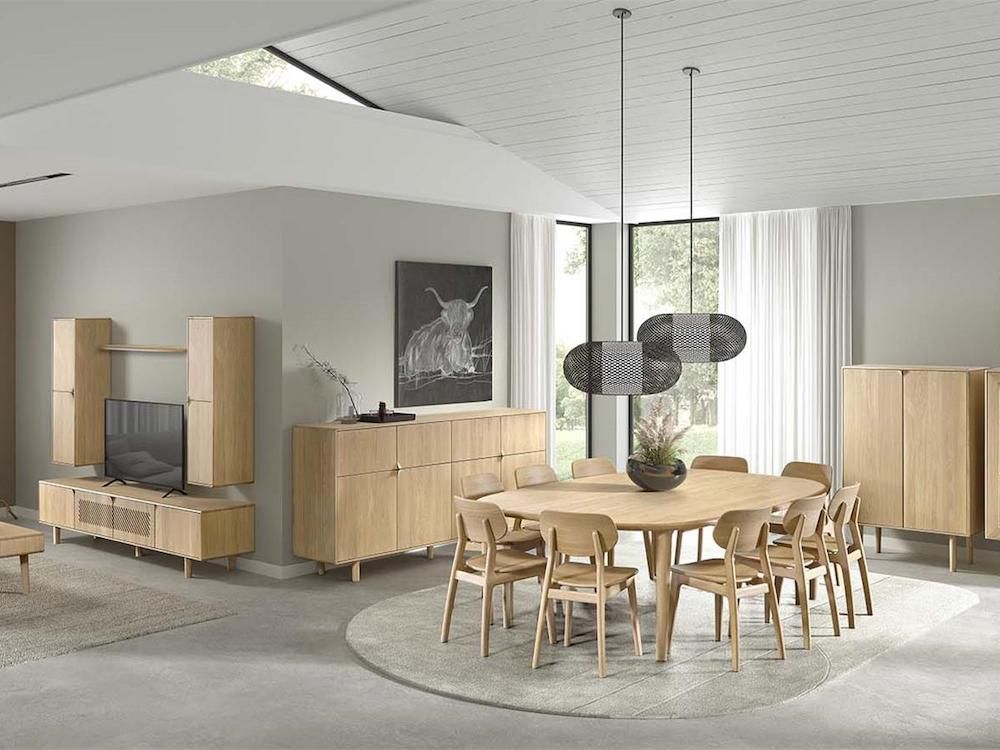 Ne cherchez plus ! Voilà la table parfaite pour vos grands repas familiaux puisqu’elle peut accueillir jusqu’à 12 convives une fois dépliée. Son plateau en chêne massif possède un système d’allonge pratique et original qui s’ouvre par le milieu pour élargir le plateau. Il sera alors facile de déposer la vaisselle et les appareils nécessaire pour une fondue jurassienne, un bon bœuf bourguignon, ou encore une raclette accompagnée d’un verre de Rully. Son design à l’esprit scandinave avec des formes arrondies et une essence de bois chaleureuse invite au partage et apporte une touche d’élégance dans votre séjour. Elle se décline en 4 teintes : chêne clair, chêne blanchi, marron ou noir pour s’intégrer aussi bien dans une ambiance contemporaine avec des chaises colorées que dans une décoration vintage avec des meubles rétro.