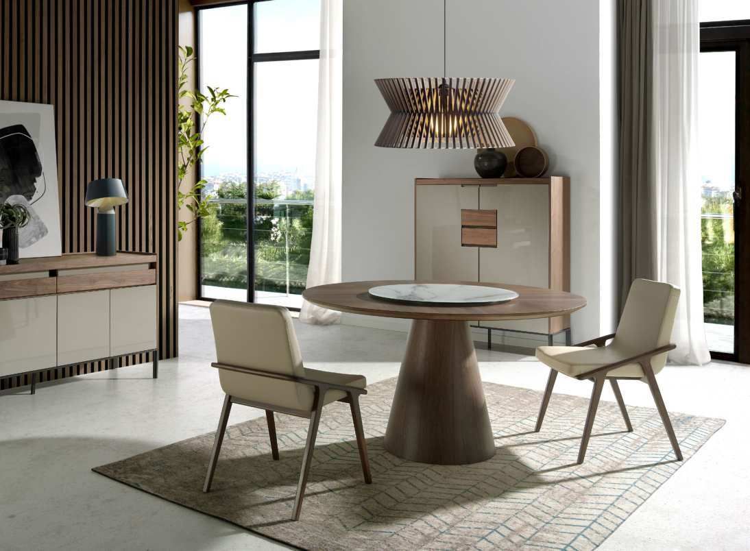 Vous êtes à la recherche d'une nouvelle table de salle à manger pour créer une atmosphère accueillante et gagner de la place dans votre espace repas afin de pouvoir ajouter un buffet ? Envisagez la table de repas ronde pour votre aménagement intérieur ! Ce modèle élégant en noyer s'intègrera facilement dans votre séjour sans avoir besoin de changer toute la déco. Il vous laissera alors profiter d'un apéro entre amis après une journée shopping à Lyon. Vous pourrez disposer autour de son plateau jusqu'à 6 chaises pivotantes et confortables. Et pour rendre encore plus conviviale ce moment, cette table de repas ronde est dotée d'un plateau tournant en porcelaine pour permettre aux invités de se servir aisement.