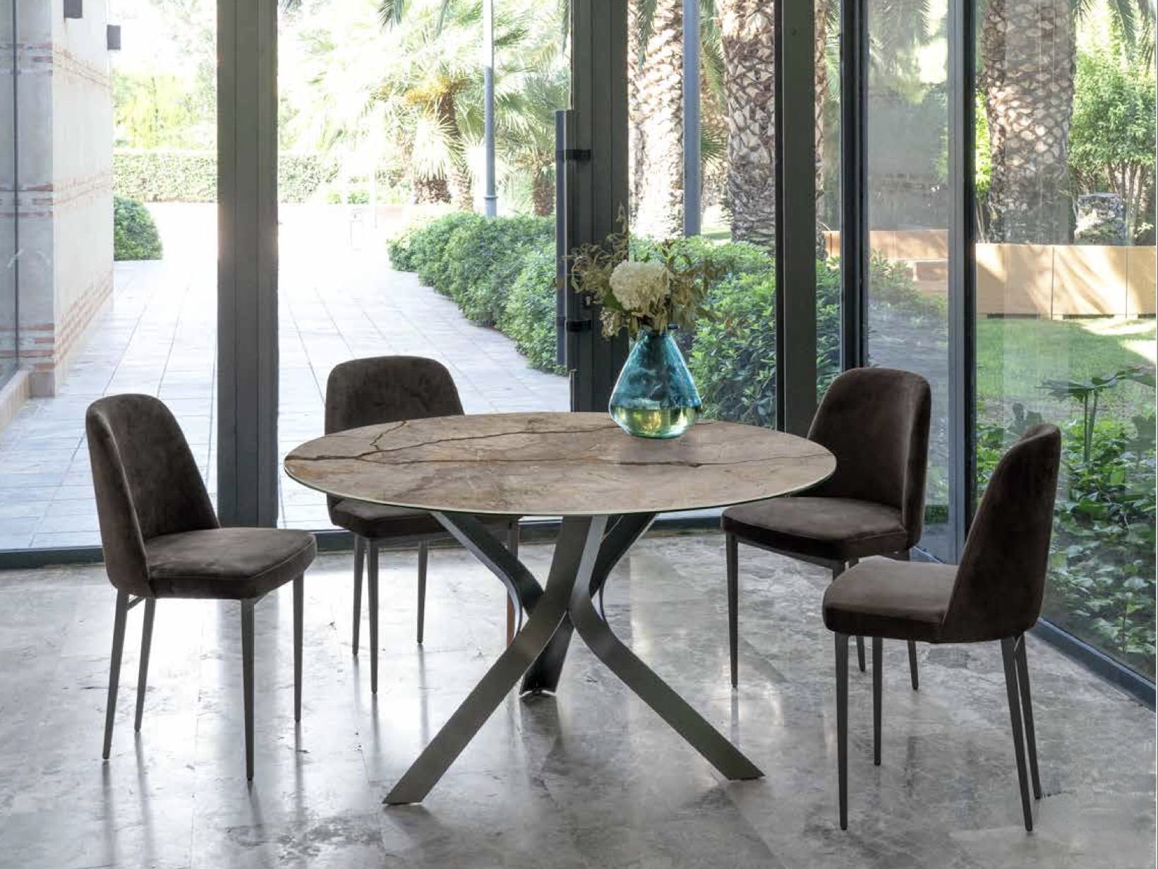 Table ronde en céramique pied métal entrecroisé
