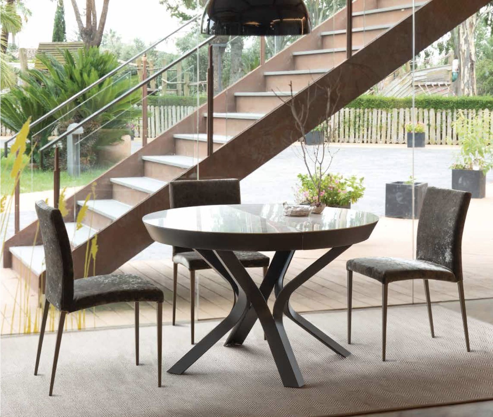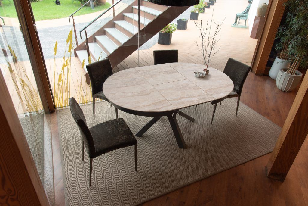 Vous êtes à la recherche d’une table élégante qui s’adapte à votre façon de vivre ? Cette table ronde devrait vous plaire. Tantôt table ronde intimiste pour 4 personnes, elle se transforme facilement en une table ovale et familiale pour 6 convives grâce à 1 allonge portefeuille de 55 cm. Les repas dominicaux deviennent alors un véritable moment de partage et de convivialité. Qu’elle soit destinée à la cuisine, à la salle à manger ou à la véranda, cette table contemporaine s’intègre avec style dans différents intérieurs. Son plateau en céramique ou dekton (option) est disponible dans différentes finitions et son élégant pied métal entrecroisé se décline en plusieurs couleurs, ce qui permet à cette table de repas d’être accompagnée de belles chaises en tissu, de mobilier contemporain ou de meubles authentiques en bois. Vous êtes séduit par l’esthétique contemporaine et originale de cette table ? Elle se décline aussi en version table ronde fixe, table ovale, et table rectangle.