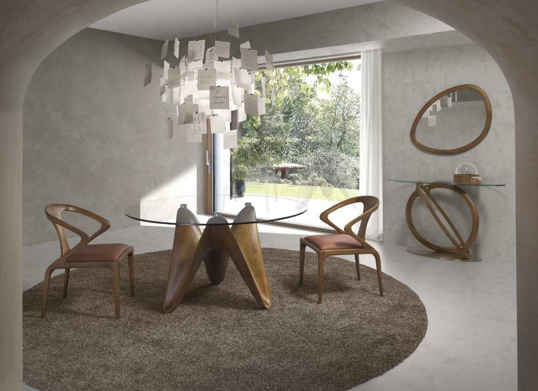 Vous rêvez d'une table au style naturel pour accompagner vos chaises en bois et votre vitrine contemporaine avec insert céramique ? Laissez-nous vous présenter cette table ronde avec son plateau en verre et sa base sculptural en noyer. Dans l'espace repas d'une maison à Digoin ou d'un appartement à Bourg-en-Bresse, sa forme se révèlera très pratique pour favoriser la circulation tout en libérant l'espace visuel. Disposée sur joli tapis beige et éclairée par un grand lustre contemporain, elle permettra de créer une atmosphère douce et conviviale. Disponible en 3 dimensions de plateau 130;140 et 150 cm de diamètre, cette table de salle à manger deviendra le coeur de vos moments de partage en vous permettant d'installer confortablement de 6 à 8 convives.
